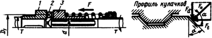 где α - угол заострения кулачка; ρ - угол трения в зацеплении кулачков (6...8°); f2 - коэффициент трения в шлицевом соединении (0,15).