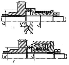 улачковые предохранительные муфты по конструкции аналогичны сцепным кулачковым. Отличие в том, что подвижная в осевом направлении полумуфта поджата пружиной к неподвижной, а рабочие грани кулачков имеют большой угол наклона (β = 30 - 60°). Работа кулачковых муфт сопровождается изнашиванием кулачков, поэтому последние должны иметь высокую твердость (> 56 HRC). На рис., а, б показаны конструктивные схемы двух кулачковых муфт в момент их срабатывания (кулачки вышли из зацепления). Для повышения точности срабатывания муфты высоту кулачков следует делать по возможности небольшой и применять пружины малой жесткости. Необходимо предусмотреть также регулирование силы нажатия пружины, замыкающей кулачковую предохранительную муфту. В муфтах (рис.а,б) регулирование осуществляют гайкой, которую затем стопорят контргайкой.