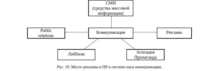 В современной литературе паблик-рилейшнз соотносится с такими коммуникационными дисциплинами, как реклама, агитация и пропаганда, журналистика и паблисити, политика и лоббирование. Поскольку в основе всех дисциплин лежит коммуникация, ее структура и составляющие, было бы неправомерно очень далеко разводить их друг от друга. Основные этапы коммуникации, ее звенья от источника до получателя, докоммуникативные и посткоммуникативные эффекты, интеркоммуникативные влияния, перевод информации в сообщения включаются в обсуждение фактически везде, но с разными целями и способами анализа (см. рис. 19). Из рисунка видно, что область паблик рилейшнз выделяется как область некоммерческих внешних и внутренних связей, направленных на создание благоприятного общественного мнения. Как уже указывалось ранее, основная стратегия паблик рилейшенз – стратегия доверия.