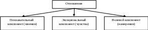 Общая оценка человеком объекта отношения определяется его мнениями и/или чувством относительно данного объекта. Однако доминировать может только один из составляющих (в частности, о пылесосе — мнение о том, насколько он хорошо чистит). Парки, зрелища определяются чувствами. Познавательный компонент определяется знаниями, убеждениями относительно объекта отношения. Эмоциональный компонент — чувством к объекту Волевой компонент связан с действиями или намерениями по отношению к рассматриваемому объекту.
