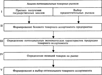 При формировании товарного ассортимента следует ориентироваться на внутренние возможности предприятия по ресурсам и мощностям, а также на доходность каждой единицы товаров. Однако окончательное решение должно приниматься с учетом доходности ассортимента в целом, поскольку исключение одного из товаров (даже малорентабельного) может существенно снизить объемы продаж по другим товарам. Процесс формирования товарного ассортимента проходит несколько этапов (рис. 2.6)