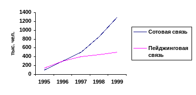 Рис. 17. Число абонентов сотовой и пейджинговой связи в России.