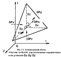 Элементарный объем в форме тетраэдра с ребрами δx, δy и δz, грани этого тетраэдра перпендикулярны соответствующим координатным осям х, у, z.