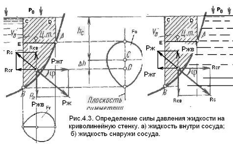 Сила давления жидкости на криволинейную стенку будет равна сила реакции стенки Rж = P и направлена в противоположную сторону.