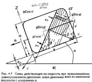 Для определения положения свободной поверхности жидкости в сосуде, движущемся прямолинейно и равноускоренно к уравнению (4.16) нужно добавить уравнение объемов, т. е. нужно знать первоначальный объем жидкости в сосуде и выразить его через размеры сосуда В и Н и первоначальный уровень h.