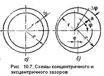 Этим выражением можно также пользоваться в том случае, когда зазор образован двумя цилиндрическими поверхностями, например, поршнем и цилиндром, при условии, что зазор между ними мал по сравнению с диаметрами поверхностей, и поверхности расположены соосно (рис. 10.7б).