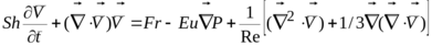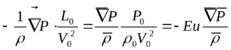 В уравнении движения в форме все члены имеют размерность ускорения. Приведем уравнение движения к безразмерному виду, отнеся его к характерному конвективному ускорению. Под характерным будем понимать характер, определяющий границы или особенности процесса. Например, в качестве геометрического линейного размера при обтекании аэродинамического профиля- это его хорда, для трубы- диаметр, для скорости- скорость потока на бесконечности и т. д. Выберем в качестве масштаба, не привязывая их к конкретной схеме течения, для скорости- , для линейного размера- , плотности - , тогда характерное время .Конвективное ускорение в выбранных масштабах: