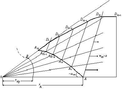 и представляет собой прямую, являющуюся продолжением контура ВАn до его пересечения в точке D1 с характеристикой 1‑го семейства Аn–1 D1. За точкой D1 элемент линии тока совпадает с направлением скорости в точке