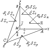 окажем, что вектор напряжения Pn можно представить как произведение орта нормали n площадки и некоторого тензора второго ранга P, который является функцией только вектор‑радиуса r. С этой целью рассмотрим вырезанный в среде элементарный тетраэдр MABC (рис. 5). Пусть площадь ABC равна Sn, а другие площадки, представляющие проекции ABC на координатные плоскости, равны Sx, Sy, Sz соответственно (причем индексы x, y, z при этих площадках означают ось, перпендикулярную площадке).