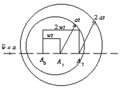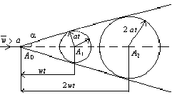 р и м е р 1. Рассмотрим источник возмущений, расположенный в точке A0. Если на источник набегает дозвуковой поток (w < a), то волны будут сноситься вниз по потоку: при этом центр волн перемещается со скоростью w < a, а сами волны распространяются со скоростью звука а. За некоторое время t центр волны сместится на расстояние wt, а радиус волны будет r = at, причем at wt (рис. 6). Таким образом, возмущения в дозвуковом потоке распространяются и против течения. При этом область возмущения опережает тело, а форма потока изменяется еще до того, как частицы газа придут в соприкосновение с телом.