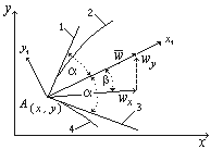 арактеристики в физической плоскости имеют определенный физический смысл, который можно установить, если определить угол между вектором скорости w в некоторой точке потока и направлением характеристики в той же точке (рис. 38). Этот угол определяется при помощи уравнения (5.16), если отнести его к местной системе координат x1, y1 с началом в точке A и с осью x1 , совпадающей с направлением вектора w. При таком выборе осей координат wx = w,