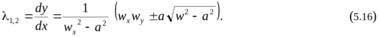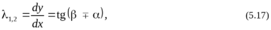 x, y определяются из решения уравнения (5.12), в котором знак «+» соответствует характеристикам 1‑го семейства, а знак «–» – характеристикам 2‑го семейства. Величина 1, 2 = dy / dx определяет угловой коэффициент характеристик этих семейств.