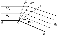 Мы знаем, что конечные адиабатические скачки разрежения невозможны. Поэтому необходимо разбить угол KCL на бесконечно большое число бесконечно малых углов и перейти от рассмотренной ранее условной схемы с малыми скачками разрежения к схеме непрерывного расширения газа. Поворот потока около тупого угла надо рассматривать как последовательность слабых возмущений, источником которых служит вершина угла.