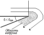 ля воздуха max = 220 (рис. 21). Если взять пр, то после поворота поток отрывается и следует по линии тока, соответствующей пр. Между стенкой и этой линией тока образуется область вакуума. Это явление называется срывом сверхзвукового потока (рис. 22). Рассмотренная теория сверхзвукового течения внутри и вне вершины угла может быть положена в основу описания сверхзвукового движения газа около выпуклой поверхности (см. рис. 23 на с. 50).
