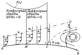 отрыв погранслоя. Рассмотрим обтекание некоторой криволинейной поверхности АВ (например, крыла), предполагая, что давление внешнего потока Р(х) вначале уменьшается, достигая минимума в точке М, а затем увеличивается (см. рис. 49). Участок внешнего потока, в котором P / x < 0, называют конфузорным. Участок с P / x > 0 называют диффузорным. На конфузорном участке внешний поток ускоряется, а на диффузорном – тормозится. Учитывая, что в погранслое P / y = 0, заключаем, что аналогичное распределение давлений имеет место и вдоль поверхности АВ