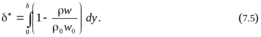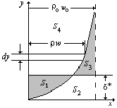 Условные толщины и интегральное уравнение для погранслоя. Вообще говоря, понятие толщины погранслоя не имеет точного количественного смысла. Значение физической толщины зависит от того, где выбрана точка, условно показывающая границу слоя. За можно принять расстояние от стенки, на котором w составляет 99% от w. Поэтому в теории погранслоя вводятся иные, интегральные толщины – 1) толщина вытеснения *,