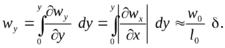 становимся подробнее на системе (7.1). Пусть размером для характеристик вдоль оси x, т. е. их масштабом, будет размер l0 , а вдоль оси y — толщина слоя (рис. 48). Характерной скоростью wx вдоль оси x считаем скорость набегающего потока w0 . Из уравнения неразрывности следует, что производные wx / x и wy / y являются величинами одного порядка. Это позволяет установить масштаб поперечной скорости wy: