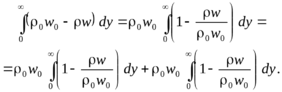 в пограничном слое (рис. 50). Через элемент сечения слоя высотой dy и шириной, составляющей единицу, протекает секундная масса, равная w dy. При отсутствии вязкости через это сечение протекала бы секундная масса 0w0 dy. Разность этих количеств составляет: