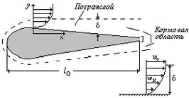Современные представления о механизме сопротивления тел, обтекаемых потоком газа, и методы расчета этих сопротивлений основываются на теории пограничного слоя. Как показывает опыт, влияние вязкости жидкости или газа сосредотачивается в области потока, непосредственно прилегающего к поверхности тела. Эта область имеет малую по сравнению с длиной тела протяженность в направлении нормали к поверхности тела и называется пограничным слоем. Вне пограничного слоя поток имеет очень малую завихренность и на этом основании рассматривается как квазипотенциальный. В пограничном слое скорости меняются от нуля на поверхности тела (гипотеза прилипания) до скорости внешнего потока. Так как толщина слоя невелика, то градиенты скоростей в этой области достигают больших значений и, следовательно, поток обладает значительной завихренностью.