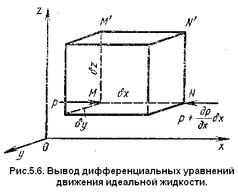 В потоке идеальной жидкости возьмем произвольную точку М с координатами x, y, z (рис.5.6) и выделим вблизи этой точки малый объем в форме прямоугольного параллелепипеда так, чтобы точка М была одной из его вершин. Пусть ребра этого параллелепипеда будут параллельны координатным осям и соответственно равны δх, δу и δz, тогда его объем равен δW = δх*δу*δz, а масса δМ= ρδхδуδz.