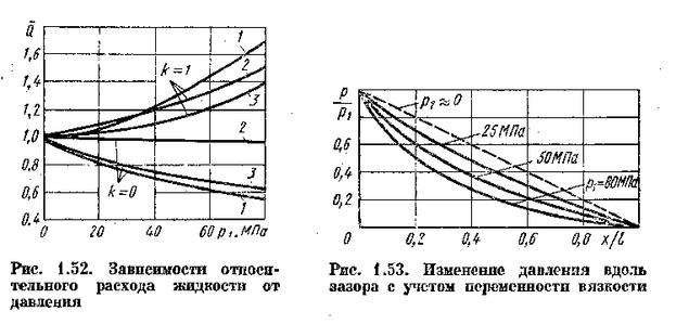 от Р1 по формуле (1.99) для трех жидкостей : керосина(1), трансформаторного масла (2) и жидкости АМГ-10(3), причем для двух случаев : k=1 отсутствие теплообмена) и k = 0 (изотермическое течение). Кривые, соответствующие двум крайним режимам, расходятся довольно существенно. Реальные процессы описываются кривыми, которые располагаются между этими предельными кривыми. В связи с тем, что скорости течения жидкости в зазорах при столь высоких перепадах давления очень велики и каждая частица пребывает в зазоре вес ьма незначительное время, более вероятными представляется режим течения , при котором k = 1 т.е. теплообмен играет незначительную роль. Это предположение подтверждается новыми экспериментами по исследованию изотермического течения в зазорах, проведенными Солиным. Однако, эти же исследования показывают, что при увеличении относительной длины зазора l/a и числа Прандтля, равного Pr= μc/λ (c – теплоемкость, λ - коэффициент теплопроводности, а также при уменьшении числа Re роль теплообмена возрастает, и процесс течения может приближаться к изотермическому.