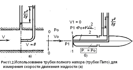 В фиксированной точке потока величина скорости может быть измерена и зафиксирована во времени с помощью трубки полного напора или "трубки Пито" (рис.11.2).