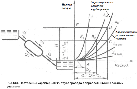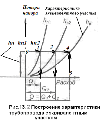 На рис. 13.2 показано построение характеристика разветвленного участка трубопровода, состоящего из двух параллельных труб. hп1 и hп2 –графики потерь в параллельных ветвях, построенные по формулам (13.11). Методика построения следующая.