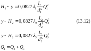 1.Если это уравнение дает значение У’ < Н2, при включении трубы 2 работа сложного трубопровода будет соответствовать рассмотренному выше первому расчетному случаю, и для решения задачи нужно воспользоваться системой уравнений (13.11).