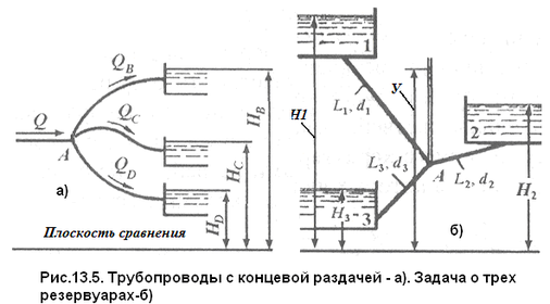 Расчет трубопровода с концевой раздачей рассматривается на примере "задачи о трех резервуарах" (рис. 13.5б).