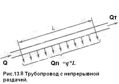 Трубопроводом с непрерывной раздачей называется такой трубопровод, в котором на некоторой длине L часть расхода Qп (путевой расход) равномерно потребляется в большом числе пунктов, расположенных на одинаковых расстояниях друг от друга (рис. 13.8).