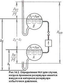 Если давление в резервуарах при работе насоса не равно атмосферному, см. рис. 14.2, например, в питающем резервуаре имеется вакуум, а в напорном резервуаре - избыточное давление больше атмосферного, статический напор равен разности пьезометрических уровней в резервуарах. Статический напор установки