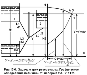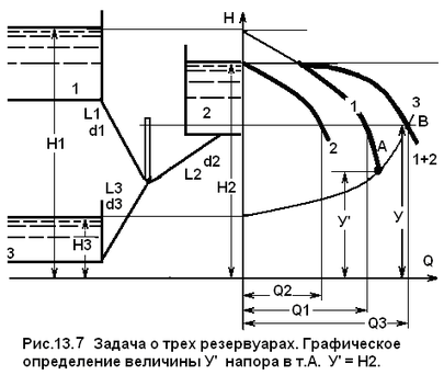 3. Если определенный таким образом напор У’ = Н2, как на рис.13.6, то абсцисса точки А дает величину действительного расхода в ветвях 1 и 3 (Q1 = Q3 ). Расход Q2 =0.