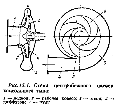 На рис.15.1 изображена простейшая схема центробежного насоса.