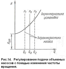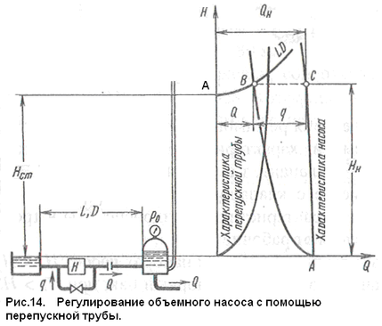 На рис. 14.17 показана схема насосной установки с объемным насосом и перепускной трубой, снабженной регулируемым дросселем.