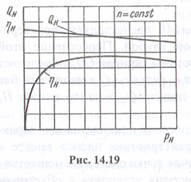 При указанном приближении линии напора Нн = f(Qн) на характеристиках объемных насосов можно показать в виде вертикальных прямых Qн =const, каждая из которых соответствует определенной частоте вращения насоса (рис. 14.16). В действительности подача любого объемного насоса при данной частоте вращения несколько уменьшается с ростом напора насоса.