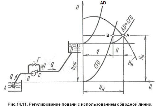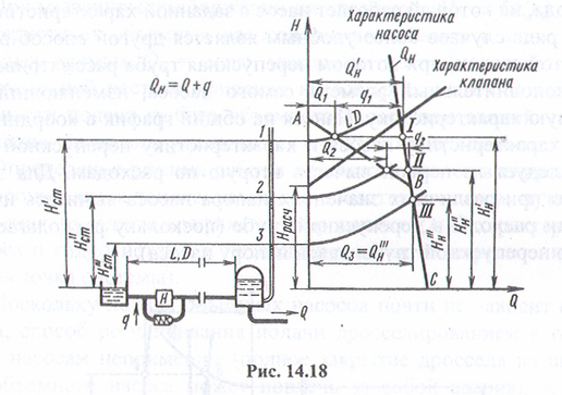Как видно на рис. 14.18, при напорах насоса Нн < Нрасч (случай 3) вся подача насоса идет в напорный бак; при Н > Нрасч (случаи 1 и 2) часть подачи насоса возвращается на сторону всасывания.