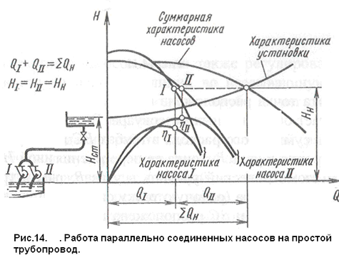 На рис. 14.14 показана схема параллельной работы центробежных насосов на простой трубопровод и дано графическое решение этой задачи.