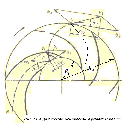 На рис. 15.2 штрих-пунктирной линией изображена траектория частицы от входа и до выхода из насоса в относительном движении – АВ, траектории переносного движения совпадают с окружностями на радиусах колеса, например на радиусах R1 и R2. Траектории частиц в абсолютном движении от входа в насос до выхода – АС. Движение подвижной системы –относительное, в подвижной – переносное.
