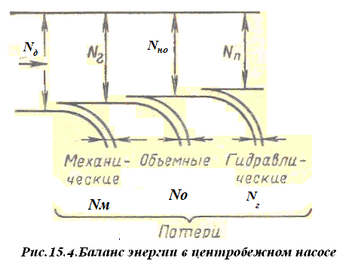 На рис. 14.4 изображен баланс энергии в лопастном насосе. К насосу подводится мощность Nд. Часть этой мощности теряется.