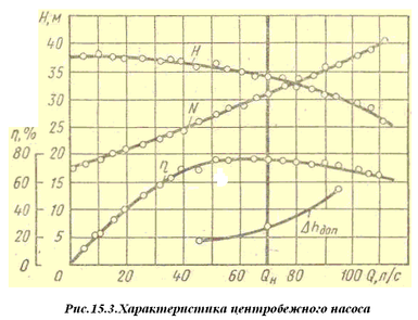 Прикрывая задвижку, установленную на напорном трубопроводе насоса, уменьшают подачу. При этом также изменяется напор, развиваемый насосом. Для эксплуатации насоса необходимо знать, как изменяется напор, КПД и мощность, потребляемая насосом, при изменении его подачи, т. е. знать характеристику насоса, под которой понимается зависимость напора, мощности и КПД насоса от его подачи при постоянной частоте вращения (рис. 15.3).