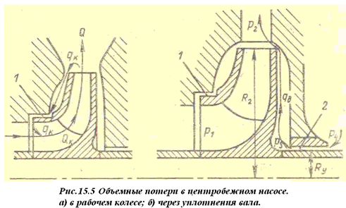 Объемные потери. Жидкость, выходящая из рабочего колеса в количестве Q , поступает в отвод (см. рис. 15.6), в напорный патрубок насоса, и частично возвращается в подвод через зазоры в уплотнении между рабочим колесом и корпусом насоса (утечка q). Энергия жидкости, возвращающейся в подвод, теряется. Потери подачи насоса через зазоры между колесом, корпусом и в уплотнениях называются объемными.