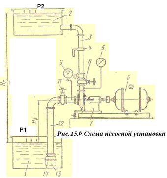 К насосу 7, приводимому в движение электродвигателем 6, жидкость поступает из приемного резервуара 1 по подводящему трубопроводу 12. Насос нагнетает жидкость в напорный резервуар 2 по напорному трубопроводу 3. На напорном трубопроводе имеется регулирующая задвижка 8, при помощи которой изменяется подача насоса, Иногда на напорном трубопроводе устанавливают обратный клапан 10, автоматически перекрывающий напорный трубопровод при остановке насоса и препятствующий возникновению обратного тока жидкости из напорного резервуара. Если давление в приемном резервуаре отличается от атмосферного или насос расположен ниже уровня жидкости в приемном резервуаре, то на подводящем трубопроводе устанавливают монтажную задвижку 11, которую закрывают при остановке или ремонте насоса. В начале подводящего трубопровода часто предусматривают приемную сетку 13, предохраняющую насос от попадания твердых тел, и пятовой клапан 14, дающий возможность залить насос, а также подводящий трубопровод 12 жидкостью перед пуском. Работа насоса контролируется по расходомеру 4, который измеряет подачу насоса, и по манометру 5 и вакуумметру или манометру 9, дающим возможность определить напор насоса.