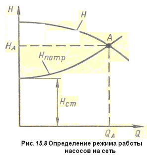 Для определения режима работы насоса следует на одном и том же графике в одинаковых масштабах нанести характеристики насоса и насосной установки (рис.15.8).