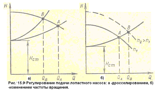 Если задвижку прикрыть, то сопротивление трубопроводов увеличится, характеристика насосной установки пойдет круче (рис. 15.9а) и точка пересечения характеристик насоса и насосной установки переместится влево (из А в В)