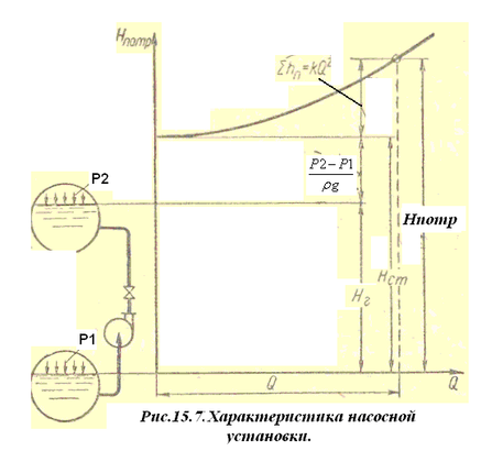 Hпотр = Нг + (Р2 —Р1)/ρg + Σh = НСТ + Σh, (15.15)