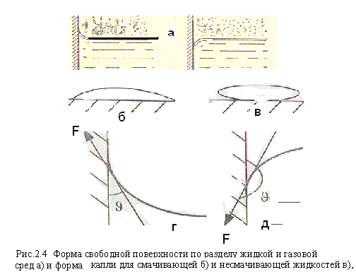 Поверхность у стенок сосуда искривлена (рис.2.4), и искривление сопровождается появлением дополнительного давления. Касательная к проекции сферической поверхности, направленная в сторону стенок трубки в зависимости от смачивания (рис.2г) или не смачивания (рис.2д) твердой поверхности жидкостью может иметь разный краевой угол θ, соответствующий смачиванию или его отсутствию.