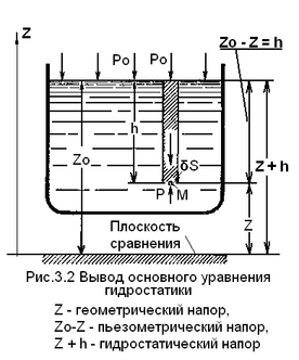 Возьмем на произвольной высоте относительно сосуда горизонтальную плоскость, которую назовем плоскость сравнения (рис.3.2), от которой вертикально вверх будем отсчитывать координаты. Обозначив через Z координату точки М, через Z0 — координату свободной поверхности жидкости и заменив в уравнении (3.1) h на Z0 — Z, получим