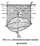 Описанный выше прием нахождения вертикальной составляющей силы давления жидкости па криволинейную стенку используют для доказательства закона Архимеда.