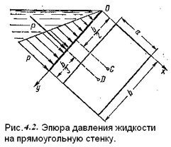 Если стенка имеет форму прямоугольника размерами а × b (рис. 4.2) и с одной стороны - атмосферное давление, центр давления D находится па расстоянии b/3 от нижней стороны.