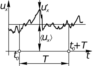 Аналогичные соотношения можно записать и для других компонент.Таким образом, осредненная скорость - это какое-то устойчивое значение, вокруг которого происходит изменение рассматриваемой проекции скорости (в данном случае ). Все сказанное в равной мере относится и к другим параметрам, в частности, к давлению.